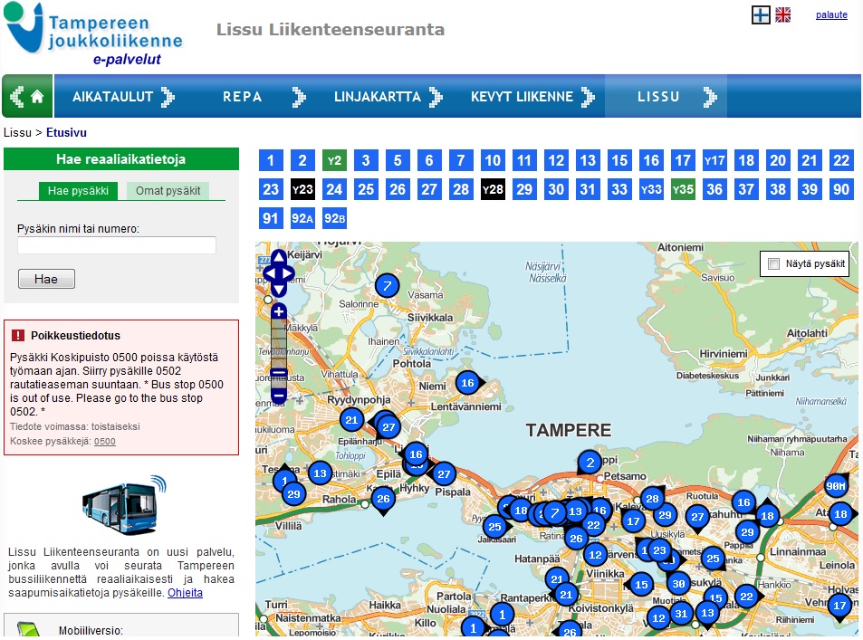 | 25. huhtikuuta 2014 kello 09.15 | BusTracker design document.pdf (tiedosto) | 47 KiB | Tero.piirainen (keskustelu | muokkaukset) | BusTracker is a interactive web-based software for monitoring busses used in public transportation in Tampere, Finland. | 1 | |